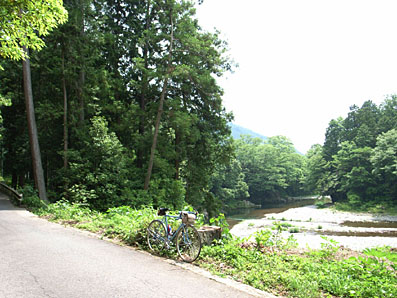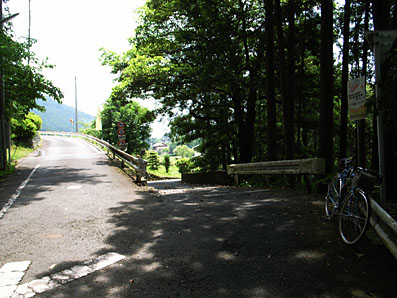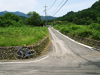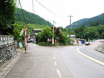 十里木が近づくと南澤林道から来る道と出会う。 左の細い道が裏道の出口、右の道は十里木の交差点に向かう。