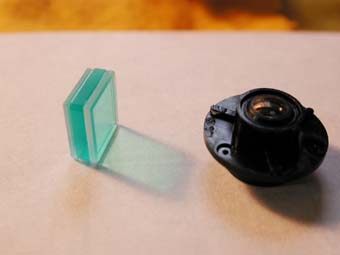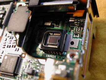 中央にあるのがCCD、右の写真の青いフィルターがこの上に乗っていた。レンズはこれだけ。