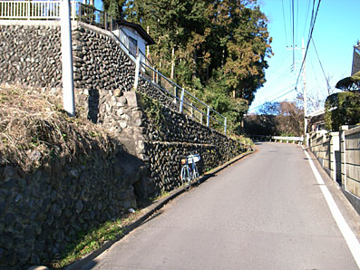五輪坂入り口。大悲願寺入り口を示す青い看板が目印。 結構な勾配です。上に見えるのは五日市線。