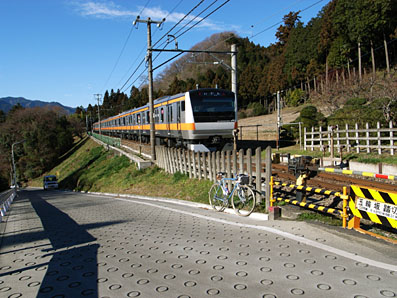 振り返ると五日市の町と奥多摩の山々。 五輪坂踏切、我が五日市線にも新型車両が増えました。