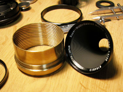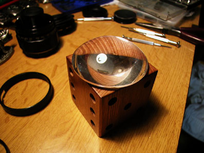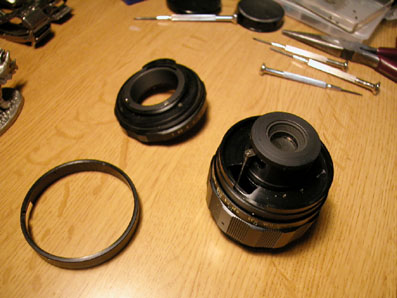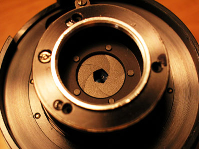 レンズの分解 SMC MACRO-TAKUMAR 50mm F4 ヘリコイドとレンズ前部 マクロレンズなのでレンズ径は小さい。 絞り部分に到達。 愛用の凸レンズ、スカイラインのプロジェクターランプ用のもの。 近所の公園で拾った。 カメラページ