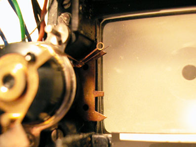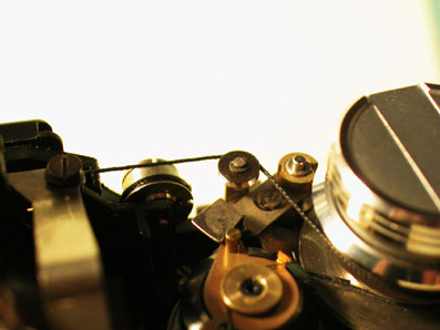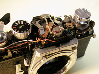 上のコードが、ファインダーの上を通って曲がってメーターに繋がる。