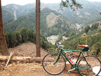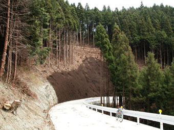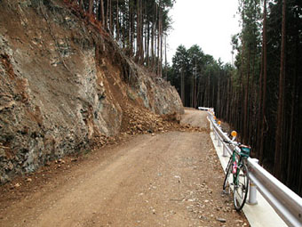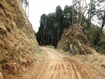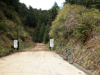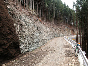 梅の木林道 2006.4月 黒く見えるところは崩落防止のコーティングのようなものがあった。 こちらは白っぽい繊維のようなものがコーティングされていた。 1カ所崩れているところがあった。 下界が見えると気分良し。 右のゲート(若駒の里前)で林道は終わり。 梅の木峠 コースガイド TOPへ