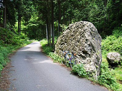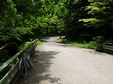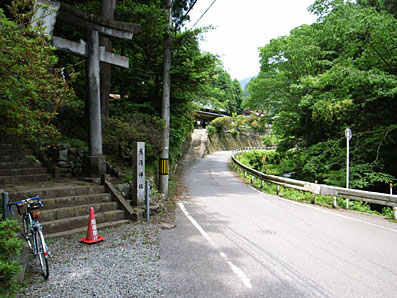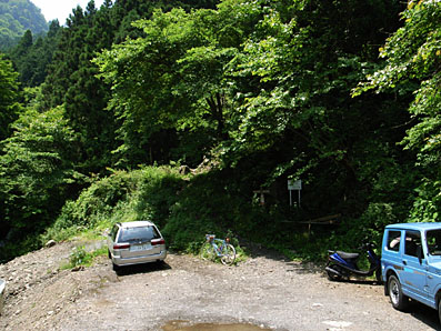 未舗装区間が少し続きますが、やがて舗装路の急登になり林道終点に到着。ここから山道を少し歩いて七代の滝に行かれます。車は釣り人のものらしい。